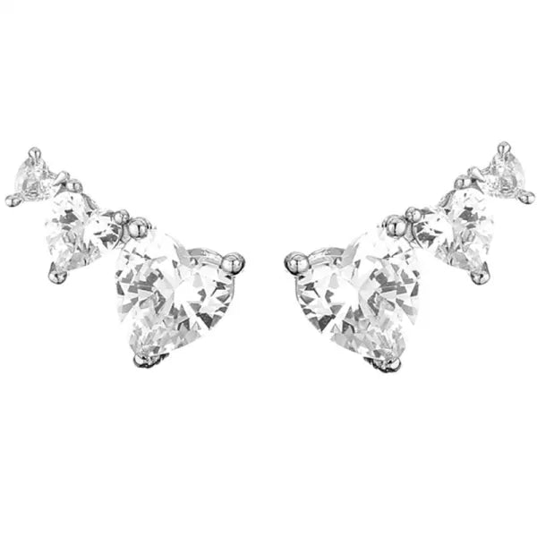 Románticos y modernos: aros trepadores plateados en acero inoxidable con circonias en forma de corazones que aportan brillo y estilo único.