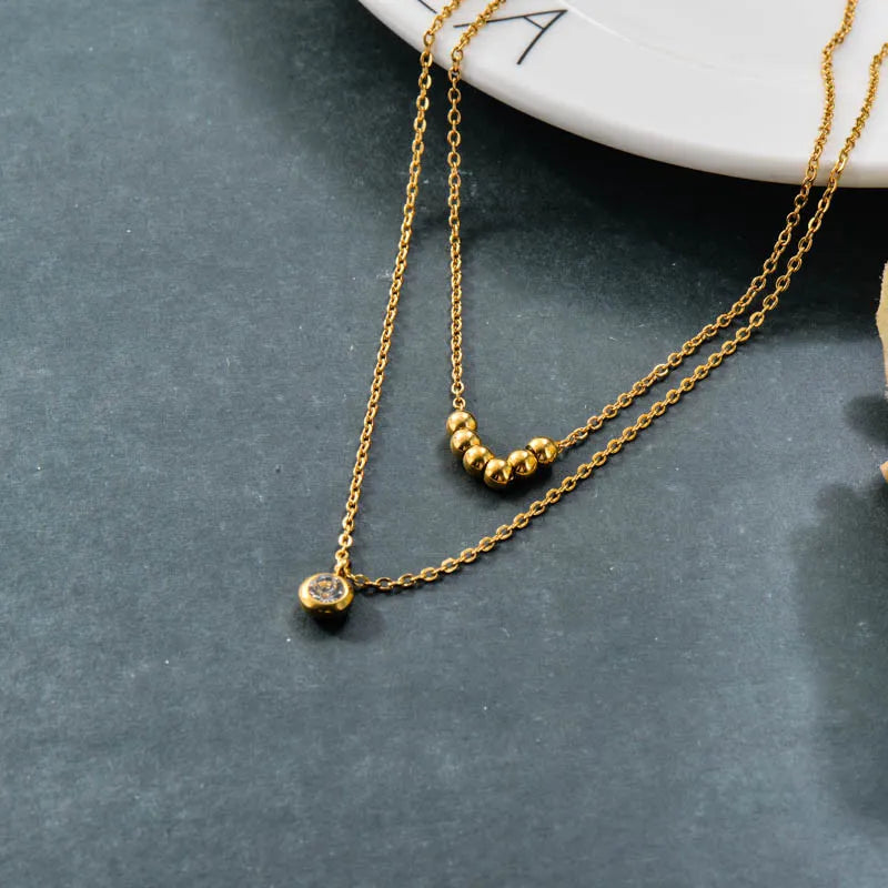 Collar doble dorado con dije brillante y esferas delicadas, perfecto para sumar estilo y elegancia a cualquier look.